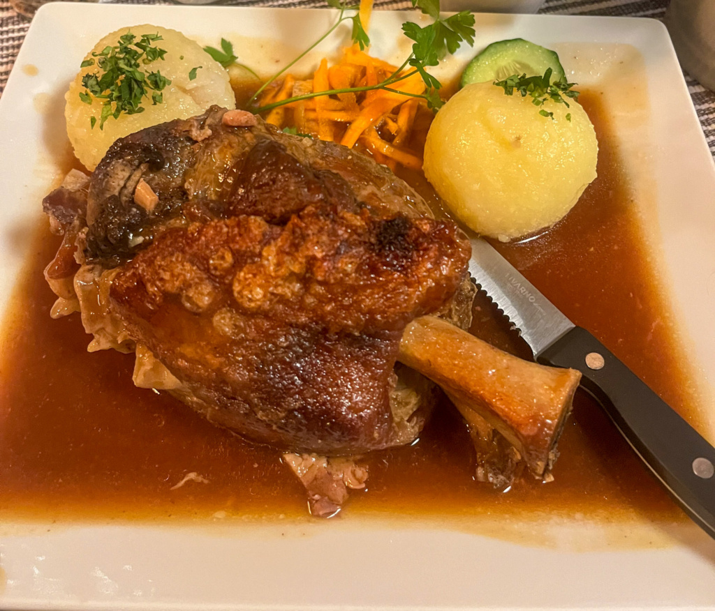 En Albrecht-Dürer-Stube, es tradicional probar el Schäufele, en otras palabras: omóplato de cerdo braseado. Nosotros probamos un omóplato y un codillo con unos dumplings como guarnición. El lugar es pequeñito por lo que se llena con facilidad.